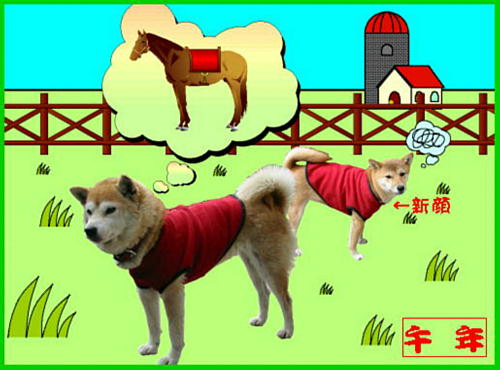 寄る歳には勝てないのかあまりに寒さで震えるので、ホームセンターで見つけたフリースジャケットを着せてやると意外に喜んで着ています。その姿が何となく競走馬に見えたので年賀状のデザインに採用したんですが、そう見えるのは私だけでしょうか…。